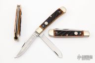 This set is 3 Model 2525 WBB 2-Blade Trappers by Boker. Mirror polished blades, nickel silver bolsters, jigged bone covers, brass liners, stainless steel spring. Comes with boxes and papers. Excellent condition.