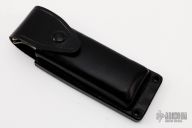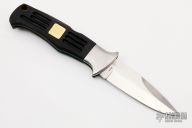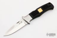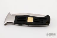 This AL MAR SERE Tactical Folding Knife features a satin finished spear point blade with a nail nick. The handle has stainless steel bolsters, textured black Neoprene with the RARE and limited GOLD Al Mar Chop inlaid on both sides, brass liners, stainless steel spring and backspacer, lanyard hole. Comes with original black leather sheath. Excellent condition.