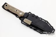 This knife by White River Knife and Tool features a tumbled blade with a notched thumbrest and a full tang construction, .159" blade stock and 1.507" blade depth. The handle features green canvas micarta scales over orange G10 liners. Features a polished stainless steel divot for use with a fire bow. Includes a steel striker tool and a kydex sheath. Comes with original box and papers. Excellent Condition.