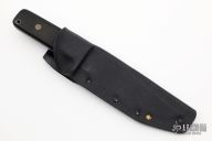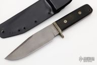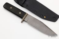 This bowie by Coats features a bead blast finish blade with swedge, .25" blade stock and 1.54" blade depth, full tang construction with black micarta scales with Corby bolts and guard. Comes with a kydex sheath. Has scuffs and scratches throughout, otherwise great user condition.