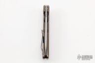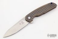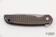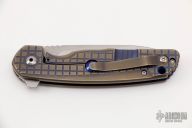 This AVO Mid-tech by Brad Southard features a tumble finished blade with notched thumbrest and flipper. The handle has a two-tone anodized frag pattern titanium frame with titanium tip up clip, titanium barrel spacers and lockbar stabilizer. Bearing Pivot. Comes with original box. Has a few light scratches, otherwise excellent condition.
