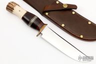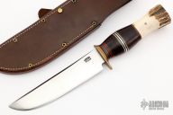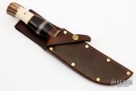 This Camp Knife by Mike Malosh features a convex ground satin finished blade with .208" blade stock and 1.458" blade depth, hidden tang construction. The handle has a bronze guard, stag butt and a spacer pattern consisting of black/red/brass/aluminum/leather. Includes a Moser brown leather slip sheath with belt loop. Comes with a zippered case. Excellent condition.