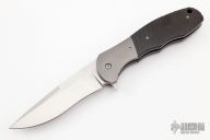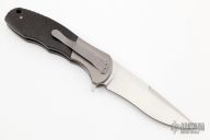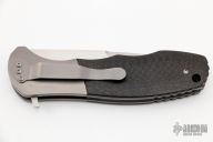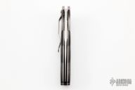 This F-5 from John W. Smith features a hand rub satin finished recurve blade with a false top edge and a flipper. The handle is comprised of dovetailed bead blasted titanium bolsters, lightning strike carbon fiber scales, bead blasted titanium liners, tip down bead blasted titanium clip, black linen micarta backspacer, and a lanyard hole at the butt. Nice detent, lockup and blade seating. Excellent condition. Comes with a zippered case.