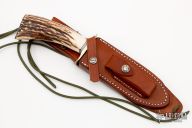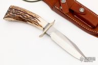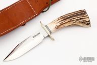This Model 15-5.5 Airman by Randall Made Knives features a satin finished clip point blade with sharpened top edge, .215" blade stock and 1.225" blade depth, hidden tang construction. The handle has a nickel silver guard and butt plate with a stag grip, black/duralumin spacers.  Includes brown leather sheath with belt loop and sharpening stone.  Excellent Condition.