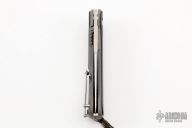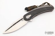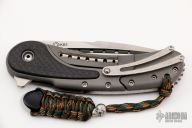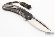 This Bodega flipper by Todd Begg Knives features a satin finished blade with a false top edge. Bead blasted titanium frame with carbon fiber inlays with cracked ice finish, matching titanium backspacer, tip up pocket clip and pivot collar. Includes IKBS (Ikoma-Korth Bearing System) for smooth and fast opening that requires no wrist action. Outstanding work. Has a light scuff on the frame, otherwise excellent condition. Includes a Velcro case.