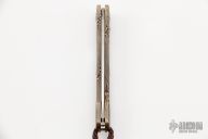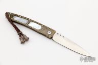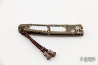 This B06-AG1 by William Henry features a hand rub satin finished ZDP-189 Core San Mai blade with nail nick. The handle has a twist pattern mokume frame with mother of pearl inlays, white topaz inlay in push button. Comes with a brown leather pocket sheath, original box and papers. Excellent condition.