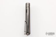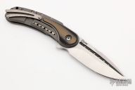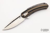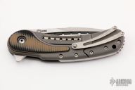 This Bodega flipper by Todd Begg Knives features a satin finished blade with a false top edge. Bead blasted titanium frame with black/tan G-10 inlays with cracked ice finish, matching titanium backspacer, tip up pocket clip and pivot collar. Includes IKBS (Ikoma-Korth Bearing System) for smooth and fast opening that requires no wrist action. Outstanding work. Has a light scuff on the frame, otherwise excellent condition. Includes a zippered case.