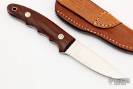 The Model L-1 is a lightweight sporting and backpacking knife made by the late Jimmy Lile. .124" blade thickness and .890" blade depth. Satin finish. Tapered tang construction. Cocobolo scales. Comes with a brown leather sheath and zippered case. Excellent condition.