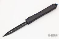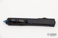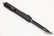 This Makora II OTF automatic by Microtech Knives features a black double edge blade and carbon fiber inserts on both sides of the black aluminum handle. Has blue anodized titanium hardware package. Dated 04/2011 and serial number 02900. Comes with a zippered case. Excellent condition.