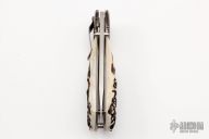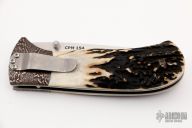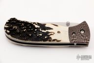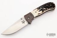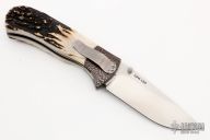 This custom FM1 by Les George features a hand rub satin finished blade with dual thumbstuds. The handle has dovetailed Damascus bolsters, stag scales, tumbled titanium liners, tip down tumbled titanium clip. Nice detent, lockup and blade seating. Very smooth action. This piece is in excellent condition. Comes with a velcro case.