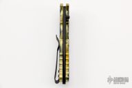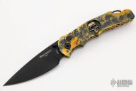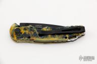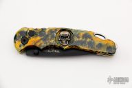 This TR-5 by Pro-Tech Knives features a black spear point blade with a single thumbstud. The handle has a PK Splash finished aluminum handle with Shaw skull inlay, stainless steel backspacer with lanyard hole, tip up blade stainless steel clip, features Matthew Lerch's Spring Assist. Comes with original sheath. This was a limited edition of 20, this one is #13. Excellent condition.
