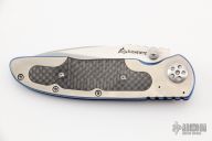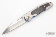 This Cortex by Allen Elishewitz features a hand rub satin finished blade with dual thumb studs and a notched thumbrest. The handle has a two-tone titanium frame with carbon fiber inlays and a tip down stainless steel clip. Strong lock up, perfect seating and nice detent. Comes with a leather pouch. Excellent Condition.
