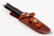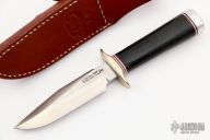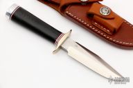 This is a miniature Model 1 - with all the features of the famous WWII full size Model 1. Stainless steel blade with top edge sharpened approximately 1 3/4 inches back from the tip, .170" blade stock and .812" blade depth, hidden tang construction. The handle has a nickel silver double guard, duralumin butt, and a black linen micarta grip with red/white/blue spacers. Comes with a brown leather sheath. In addition, the knife is authenticated by a coded transponder which cannot be altered. The transponder is inserted into the handle during construction with an encoded serial number matching the etched number on the blade. Only 1500 made. Serial number 188. Excellent condition.