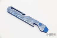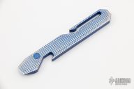 These OZ Pry Bars are .150" thick and made from a solid piece of grade 5 Titanium. They feature our golf putter milling, bottle opener, and a pocket clip slot. This one has a blue x raw satin sanded finish. Comes with original box. Excellent condition.