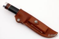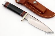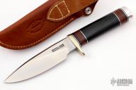 The Model 25-5 by Randall Made Knives is a drop point hunter similar to Model 11, but handle construction is reminiscent of 1930′s design. Excellent skinning, outdoors knife. This knife has a carbon steel blade with notched thumbrest, .217" blade stock and 1.300" blade depth, hidden tang construction. The handle nickel guard and duralumin pommel, black linen micarta grip with stacked leather, black and duralumin spacers. Comes with brown leather sheath and a zippered case. Excellent condition. Back of the blade reads "Kittery Trading Post 1996 41of50".