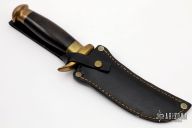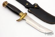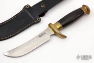 This knife by John Nelson Cooper features an upswept satin finished blade with .170" blade stock and 1.191" blade depth, hidden tang construction. The handle has brass guard and butt, canvas micarta grip. Comes with a black leather sheath and zippered case. Has some light patina, otherwise excellent condition for its age.