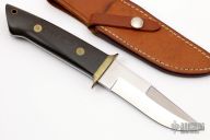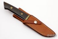 This Chute Knife by Jimmy Lile features a satin finish blade with a sharpened top edge, .183" blade stock and 1.135" blade depth, full tapered tang construction. The handle has a brass guard and pins with black linen micarta scales. Includes a brown leather sheath. Has a little patina, otherwise excellent condition. Comes with a zippered case.