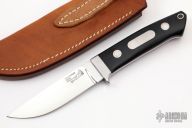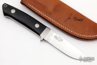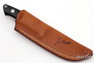 This Straight Hunter by Jim Merritt is made under the Bob Loveless name, it features a mirror finished blade with the "R.W. Loveless Knives Riverside, Calif." logo. Full tapered tang construction. Blade is .165" thick and .981" deep. Stainless steel guard and black linen micarta scales with red liners and a stainless steel escutcheon, lanyard hole. Comes with a signed leather sheath. Comes with zippered case. Excellent condition.