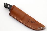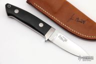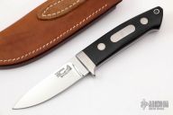 This Semi-Skinner by Jim Merritt is made under the Bob Loveless name, it features a mirror finished blade with the "R.W. Loveless Knives Riverside, Calif." logo. Full tapered tang construction. Blade is .169" thick and 1.002" deep. Stainless steel guard and black linen micarta scales with red liners and a stainless steel escutcheon, lanyard hole. Comes with a signed leather sheath. Comes with zippered case. Excellent condition.