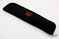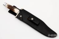 This Model 12-11 Smithsonian Bowie by Randall Made Knives features a satin finished carbon steel blade with sharpened top edge, .311" blade stock and 2.239" blade depth, hidden tang construction. The handle has a forward curved nickel silver guard and duralumin butt, stag grip with black/duralumin spacers. Comes with a black leather sheath, zippered case and original papers. Excellent condition.