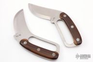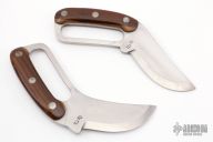 This Set of Fighting Knife by Phill Hartsfield is one of a kind. It features satin finished double ground blades with wood scales, .250" blade stock and 1.900" blade depth, full tang construction. Comes with an elephant hide covered, paper lined metal sheath that holds both knives. Excellent condition and very cool.