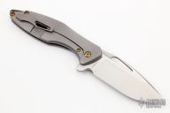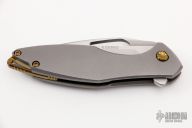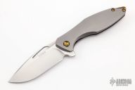 This Arius by Koenig knives features a two-tone blade with thumbhole and flipper. The handle has a nicely milled titanium frame with an anodized tip up clip, bronze anodized titanium backspacer and hardware. Has ceramic bearings and a ceramic detent ball. Nice detent, lockup and blade seating. Comes with original box and COA dated October 7, 2021. New condition.