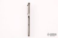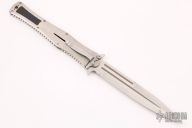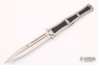 This Madd Maxx 7" Flipper by Darrel Ralph features a hand rub satin finished bayonet ground blade with false top edge, fullers. Flipper and dual thumb studs. The handle is comprised of a satin finished titanium frame with black/blue carbon fiber inlays over barrel spacers, stainless steel pocket clip is positioned for tip down carry, is also available for tip up carry. Lanyard hole in pommel. Comes with zippered case. Has some scuffs and scratches, otherwise good condition.