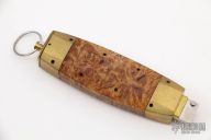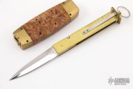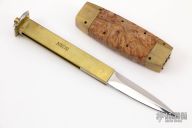 This Barrel Knife by Burn Knives features a mirror polished double edged blade. The blade sets in a brass frame that holds the blade in the open and closed positions. The handle has brass bolsters, brass center frame, maple burl scales. Has a few light scratches, otherwise excellent condition.