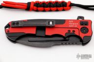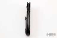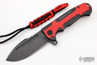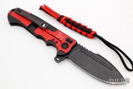 This ADV Harpoon framelock flipper has a black stonewashed blade with swedge, fullers, notched thumbrest and flipper. Handle has a red/black coated titanium frame, titanium backspacer and black tip up clip with roller, satin finished hardware. Rides on bearings, nice smooth action, detent, lockup and blade seating. Comes with nylon zippered case. Has a couple light scratches, otherwise excellent condition.