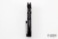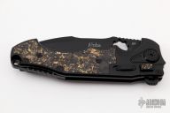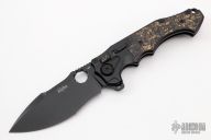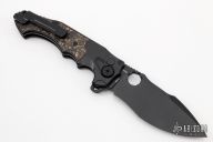 The Alpha folding knife from Andre de Villiers is a masterwork combining functionality and personality. This one has a matte finished blade with thumbhole, notched thumbrest and flipper. It swings smoothly on a ball-bearing system and has both a thumb hole and flipper opener; it can also be opened or closed with a flick of the wrist when the carbon fiber-inlaid button lock is held down. A safety switch on the side allows the blade to be locked in the closed position or provides an additional level of safety in the open position. It has a milled titanium handle in a black finish with marble carbon fiber inlays that offers an extremely comfortable grip. A jimped, black titanium backstrap with a lanyard hole and a tip-up, black, titanium pocket clip with hidden screws. Comes with a zippered case. "78-2020" on the ricasso. Excellent condition.