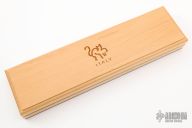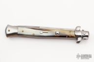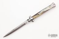 This vintage swivel bolster auto by Ducator Italy features a spear point Damascus blade with a false top edge. Stainless steel bolsters and honey horn scales, brass liners and stainless steel backspacer. Nice function, strong firing. Has a little blade play and some light patina, otherwise excellent condition. Comes with a wooden display box.