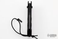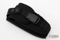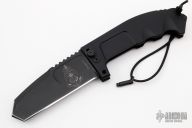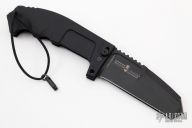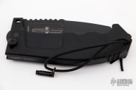 This 185° RAO Axis Lock Folder has a matte black finished N690 stainless steel spear point/ tanto blade (stamped CK06711 on A-side) with notched thumb rest and multiple grind planes. This knife features a removable threaded pin that prevents deploying the blade when stored. Handle is black aluminum with lanyard and glass breaker. Comes with original box, sheath and sharpener. Excellent Condition.