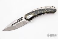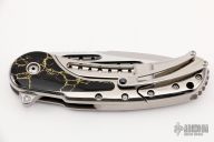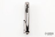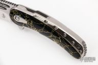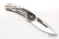 This Bodega Beggatti by Todd Begg Knives has a mirror finished multi-ground spear point blade with notched thumbrest, satin flats, fullers and flipper, 1/4" blade stock. Has IKBS. The handle has 3/16" thick mirror polished titanium frame with polished recon stone inlays, a titanium lockbar and tip up clip, 1/4" thick titanium backspacer with crosshatch jimping. Has nice detent, lockup and blade seating. Very smooth action. Excellent condition. Comes with nylon zippered case.