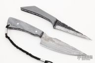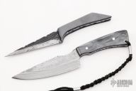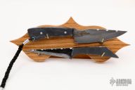 This Set by DV Customs features two knives. The first is called the Backup, it features a Damascus (1095 and 15n20) blade with fileworked spine, .126" blade stock and 1.426" blade depth, full tang construction. The handle has black kirinite scales and a fileworked tang. Comes with a COA. The second is called the Little Brother, it features a Damascus (1095 and 15n20) blade with fileworked spine, .135" blade stock and 1.025" blade depth, full tang construction. The handle has black kirinite scales and a fileworked tang. Comes with a COA. New from maker. Comes with a wooden stand that holds both knives. The Backup has some oxidation around the makers mark.