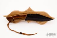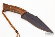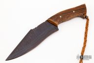 This Medium Sized Bowie by DV Customs features a blued Damascus blade with false top edge and fileworked spine, .145" blade stock and 2.019" blade depth, full tang construction. The handle has bocote scales and a fileworked tang. Comes with a wooden display stand and COA. New from maker.