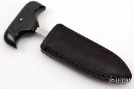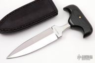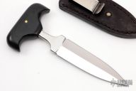 This push dagger by Steve Voorhies features a mirror polished double edged blade and a black micarta grip, .223" blade thickness and 1.255" blade depth, hidden tang construction. Great feel in the hand. Excellent work. Excellent condition. Includes black leather sheath with clip.