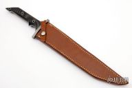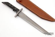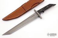This Tanto Fighter by JW Goldfarb features a matte finished blade with false top edge, .246" blade stock and 1.240" blade depth, full tang construction. The handle has a stainless steel guard with black linen micarta scales. Comes with a brown leather sheath. Has a few light spots, otherwise excellent condition.