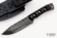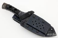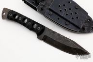 This Field Knife by Wolf Bane Blades features a dark tumbled blade with a sharpened top edge and full tang construction.  .255" Blade Stock.  1.501" Blade Depth.  The handle features sculpted G10 scales.  Includes a kydex sheath.  Sheathing marks are visible on the blade otherwise the knife is in good condition.