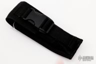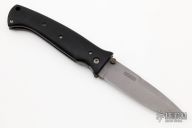 This 1994 Soldier of Fortune Knife by Butch, Rainy and Shawn Vallotton features a bead blasted spear point blade with dual thumbstuds and false top edge. The handle has black linen micarta scales, bead blasted titanium liners and bead blasted stainless steel backspacer. Nice detent, lockup and blade seating. SOF-94 #24 on blade. Has some light scuffs on the bead blast finishes, lock fails with negative pressure on the blade, otherwise good condition. Comes with a nylon belt sheath.