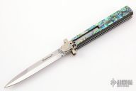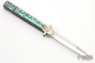 This Leverlock Auto by AGA Campolin has a polished stainless steel spear point blade with false top edge. Handle has abalone scales with black liners, nickel silver bolsters, stainless steel liners and backspacer. Has a few light scratches, otherwise excellent condition. Comes with leather slip sheath. Dated 2019