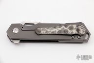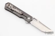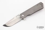 This Aagakure framelock flipper by Steel Flame features a satin finished tanto recurve blade with flipper. The handle has a bead blasted titanium frame and a laser engraved tip up clip, titanium backspacer with lanyard hole. Nice detent, lockup and blade seating. SF origami krane clip. Excellent condition.