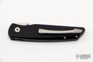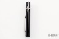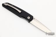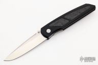 This 8801 Harkins ATAC by Pro-Tech Knives was designed by Jeff Harkins. The auto fire feature is achieved by depressing the lower corner of the first (closest to front of the handle) carbon fiber inlay. Manual opening is equally effective, and with dual thumbstuds can be accomplished with either hand. Closes via the linerlock. Has a black aluminum handle, marble carbon fiber inlays and a satin finished blade. Has an orange peel finished titanium tip up clip with hidden screws.  Comes with original box and papers. Has a couple light scuffs, otherwise excellent condition. #91 of 200