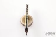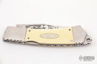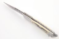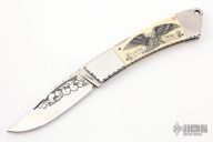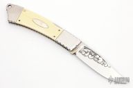 This is a bicentennial celebration lockback by Harvey McBurnette (sole authorship). Blade is high polished and engraved on both sides. Bolsters are stainless in high polish. Interior mammoth scales are scrimshawed with a bicentennial eagle on one side. A nickel silver oval escutcheon is on the other ivory scale. Fine filework on the blade spine, backspacer, bolster, and liners. Beautiful piece. Unfortunately six of the pins have ivory cracks around them (see pictures below) and there are table scratches on bolsters and escutcheon. Nice lockup and seating; strong detent.