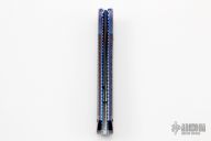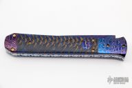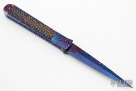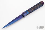 This Icepick side-opening automatic by Kyle Vallotton features a blued Damascus blade with false top edge. The handle has blued Mosaic Damascus double bolsters, and acrylic resin infused spruce cone scales with red liners, matching Damascus push button. File work on stainless steel backspacer and all around the anodized titanium liners. Strong and fast leaf spring action. Nice blade seating and lockup. Beautiful materials. Excellent condition. Comes with original box.