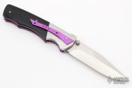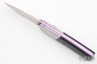This D/A bolster release auto by Thomas Vallotton features a hand rub satin finished blade with false top edge and dual thumbstuds. The handle has satin finished stainelss steel bolsters, black G-10, anodized titanium liners and tip down clip, stainless steel backspacer. Comes with original box. Excellent condition.