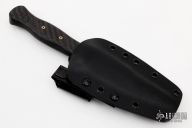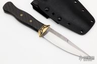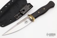 This Defender by Chuck Schuette features a hand rub satin finished clip point blade with sharpened top edge, hammer marked flats, .199" blade stock and 1.171" blade depth, hidden tang construction. The handle has a carved brass guard, carbon fiber grip and mosaic pins. Comes with a kydex sheath with Ulti-Clip. New from maker.
