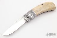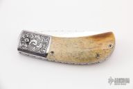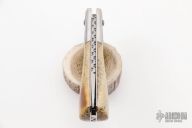 This scale release auto from A.A. Sanders features a mirror polished drop point blade with file worked spine. The handle is comprised of dovetailed and engraved stainless steel bolsters, oosic scales over stainless steel liners and fileworked backspacer. Strong spring action. Has a few light scratches, otherwise excellent condition. Comes with a zippered case.
