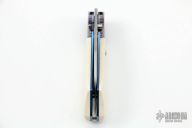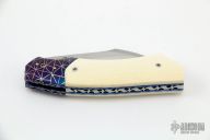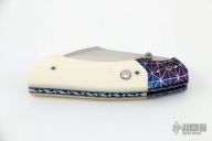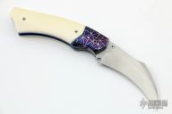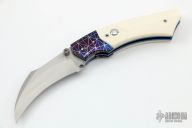 This Hawk Auto by Reese Weiland features a hand rub satin finished hawkbill blade with a single checkered thumbstud. The handle has colored Mosaic Damascus bolsters, mammoth ivory scales, fileworked and anodized titanium liners, fileworked stainless steel backspacer. Marked "RW Proto" Nice action, lockup and detent. Excellent condition. Comes with a zippered case.