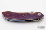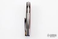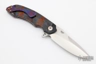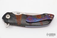 This custom Mike Vagnino designed flipper by Olamic Cutlery features a mirror finished blade, notched thumbrest and hollow flipper. The handle has mokuti scales, titanium liners, mokuti backspacer, tip up mokuti clip. Great action that requires no wrist movement. Nice detent, lockup and blade seating. WC981 inside backspacer. Comes with a zippered case. Excellent condition.