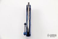 This Busker, by Olamic Cutlery features a satin finished sheepsfoot style blade with a swedge thumb hole and notched front flipper. The handle has a textured and anodized titanium frame with a textured and anodized titanium floating backspacer, tip up clip and pivot. Includes original padded case and makers card dated 12-21-2017. Excellent Condition.